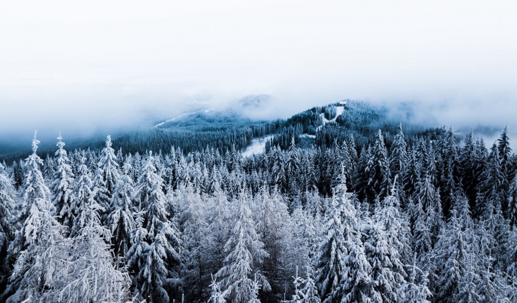 Aerial view of a forest at winter HD Wallpaper - 1024x600
