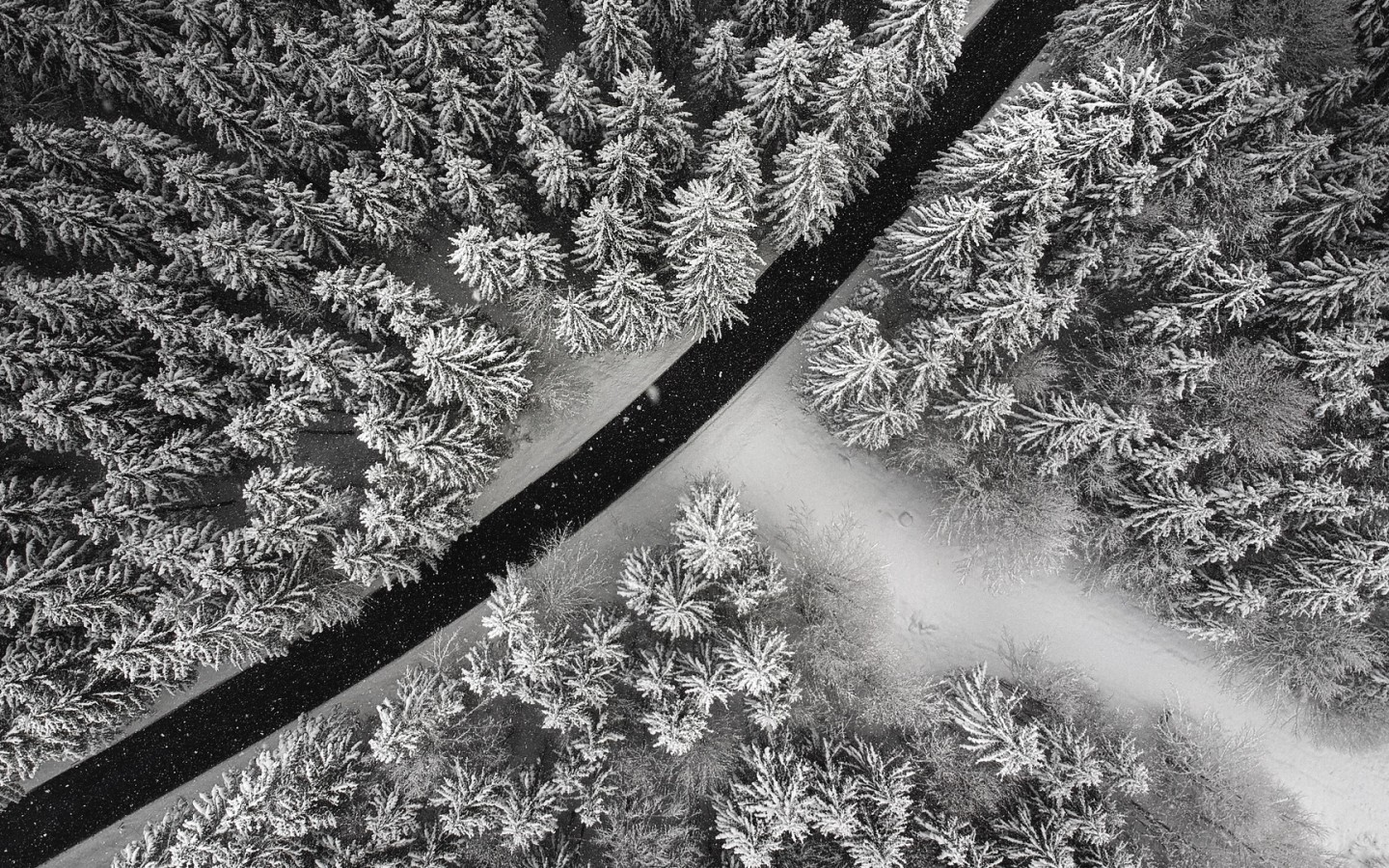 Aerial view of a snowy road HD Wallpaper - 1440x900