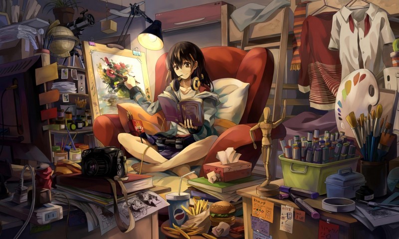Anime girlg reading book on the couch HD Wallpaper - 800x480