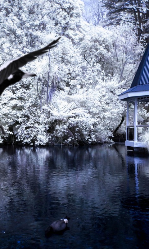 Bird Soaring Towards a Gazebo - 480x800