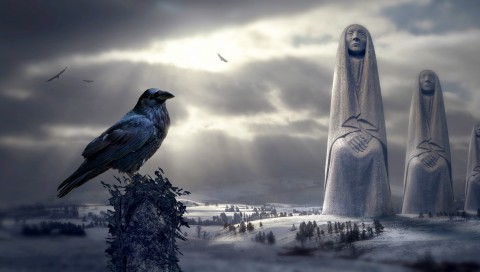 Bird starring at mystical sculptures HD Wallpaper - 480x272 PSP