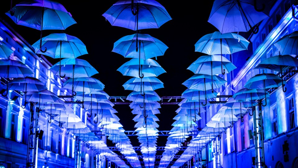 Blue umbrellas HD Wallpaper - 960x544 PS Vita