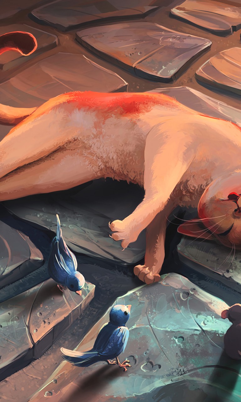 Cat lying next to birds HD Wallpaper - 768x1280