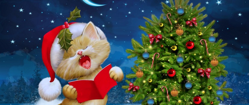 Cat singing jingle bells next to Christmas tree HD Wallpaper - Facebook Cover Photo
