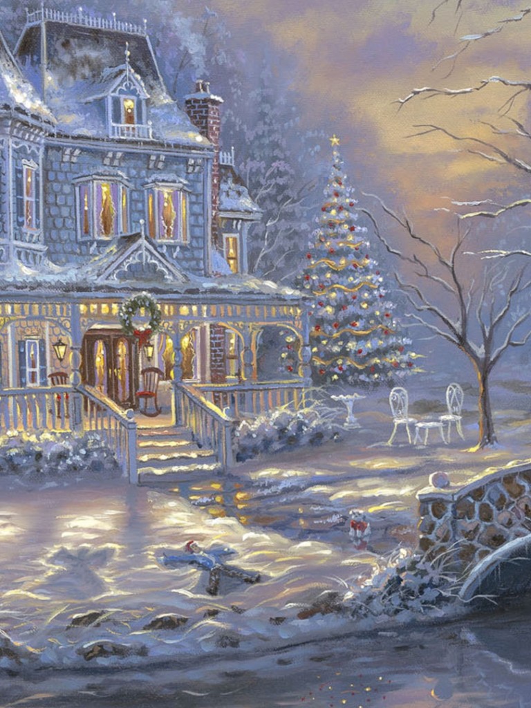 Children playing with snowman outside of their house HD Wallpaper - Non-retina iPad