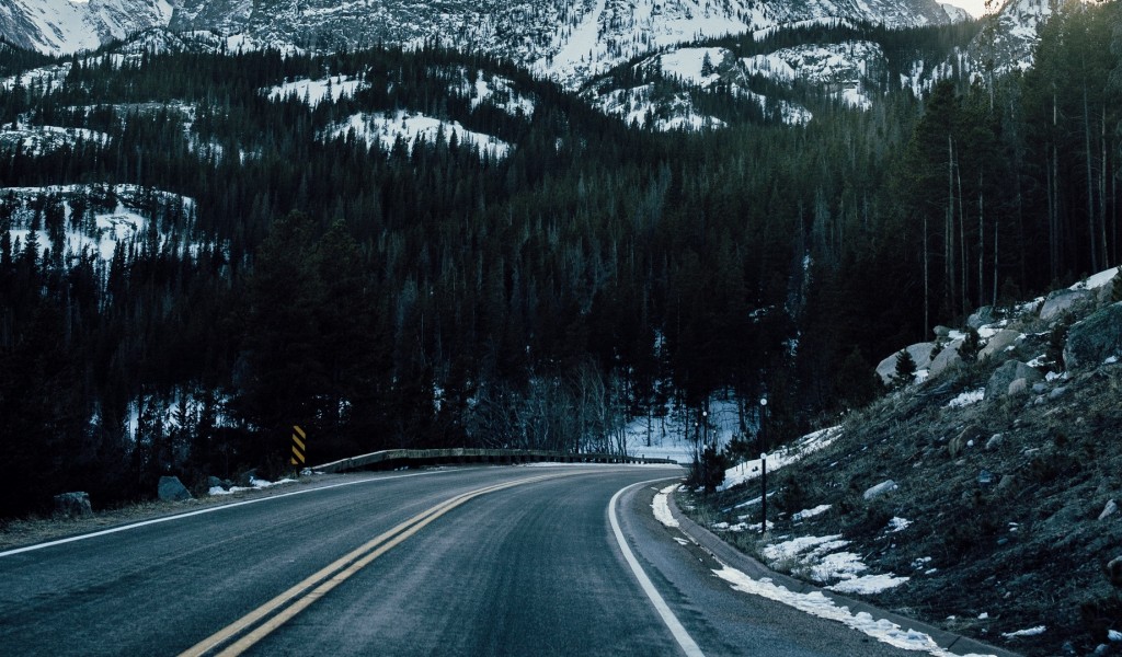 Driving through mountains covered in snow HD Wallpaper - 1024x600