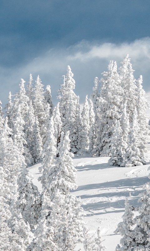Flying over a snowy forest HD Wallpaper - 480x800