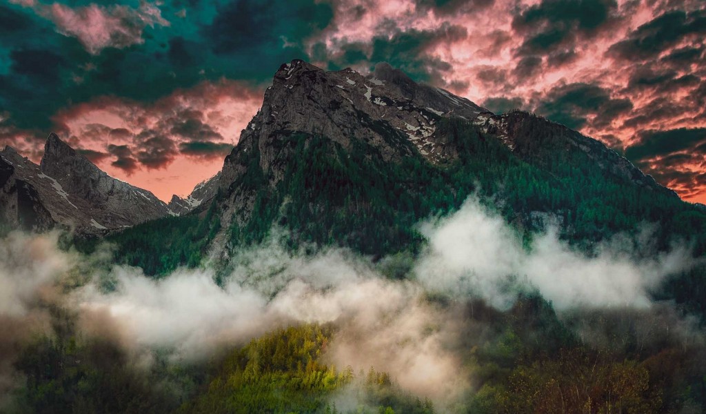Fogy forest under the mountains HD Wallpaper - 1024x600