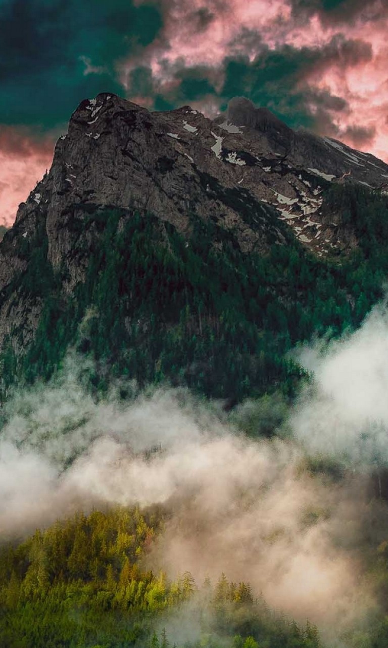Fogy forest under the mountains HD Wallpaper - 768x1280