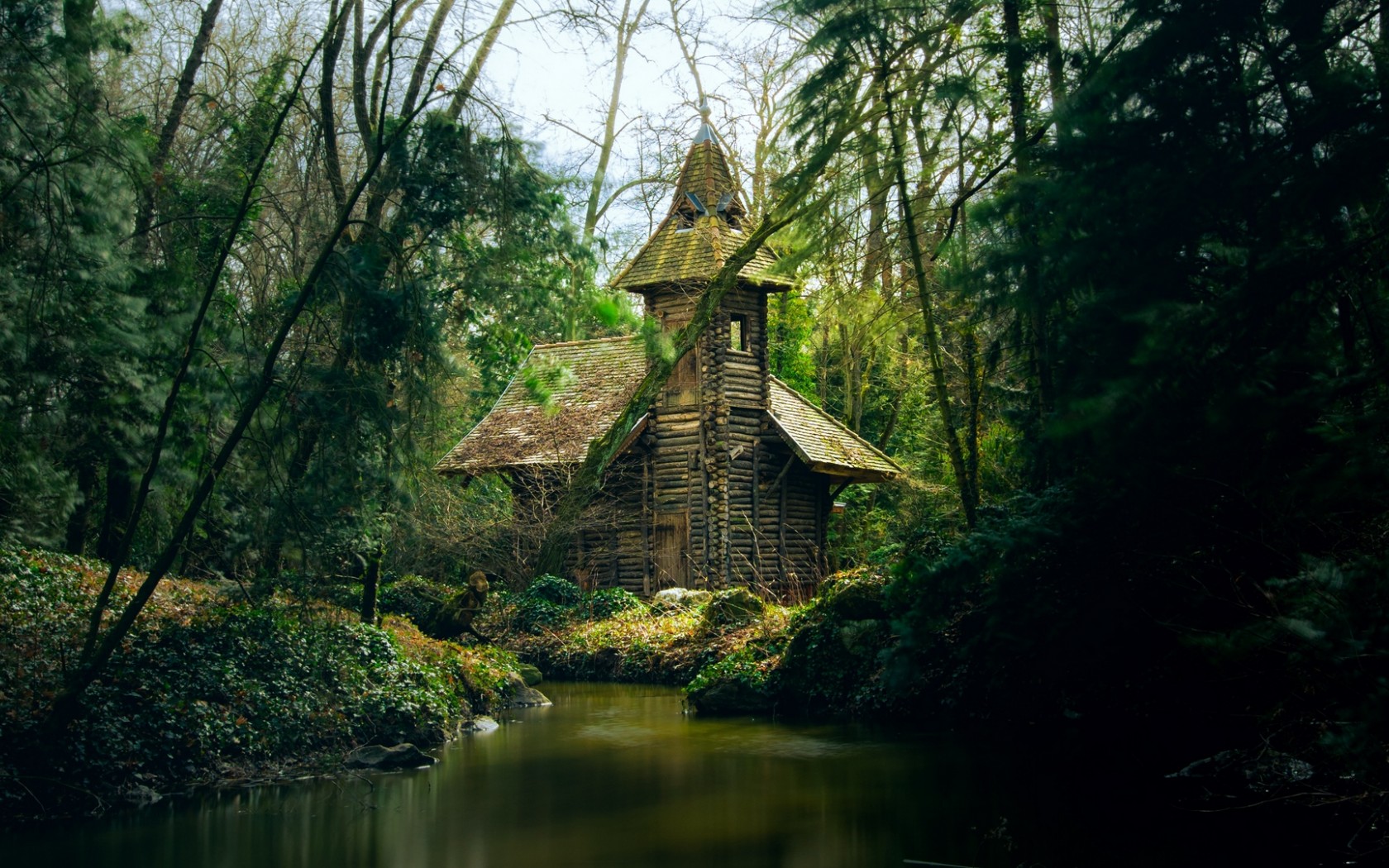 Forest house next to the river HD Wallpaper - 1680x1050