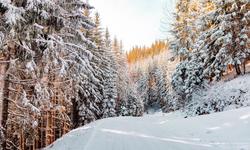 Forest road covered in snow HD Wallpaper - 800x480
