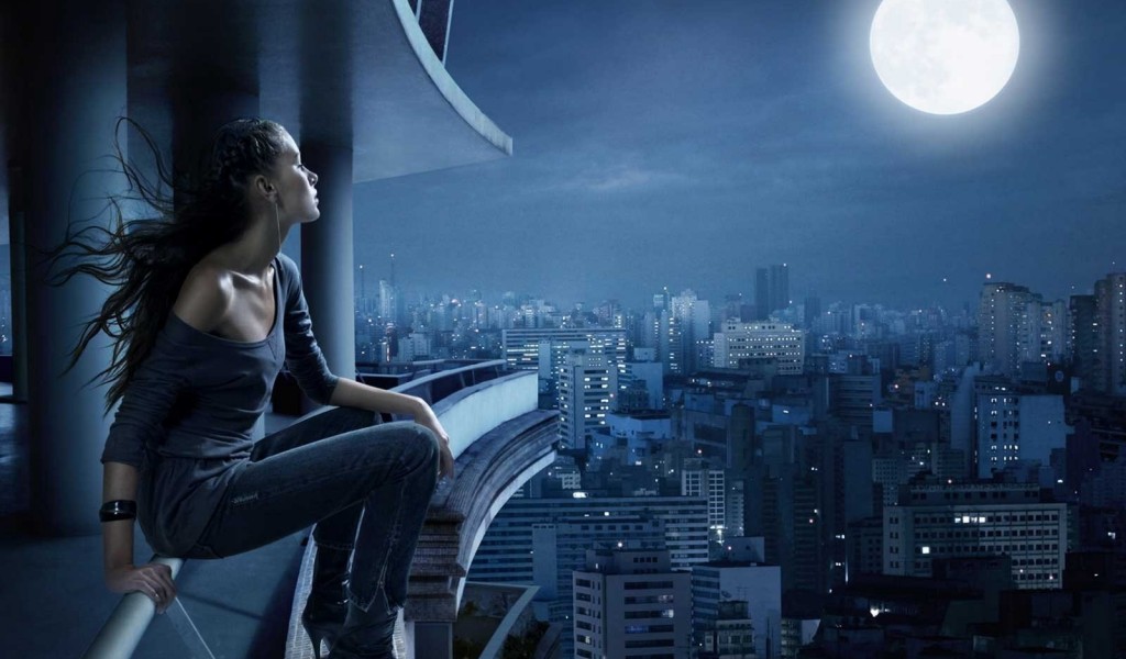Girl watching the moon HD Wallpaper - 1024x600
