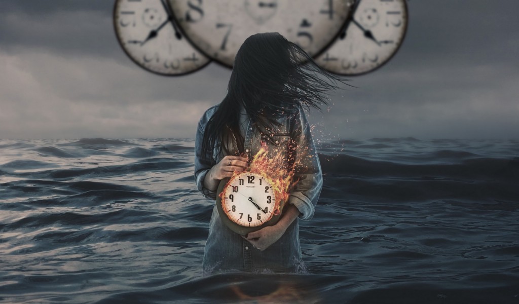 Girl with a clock inside the sea HD Wallpaper - 1024x600
