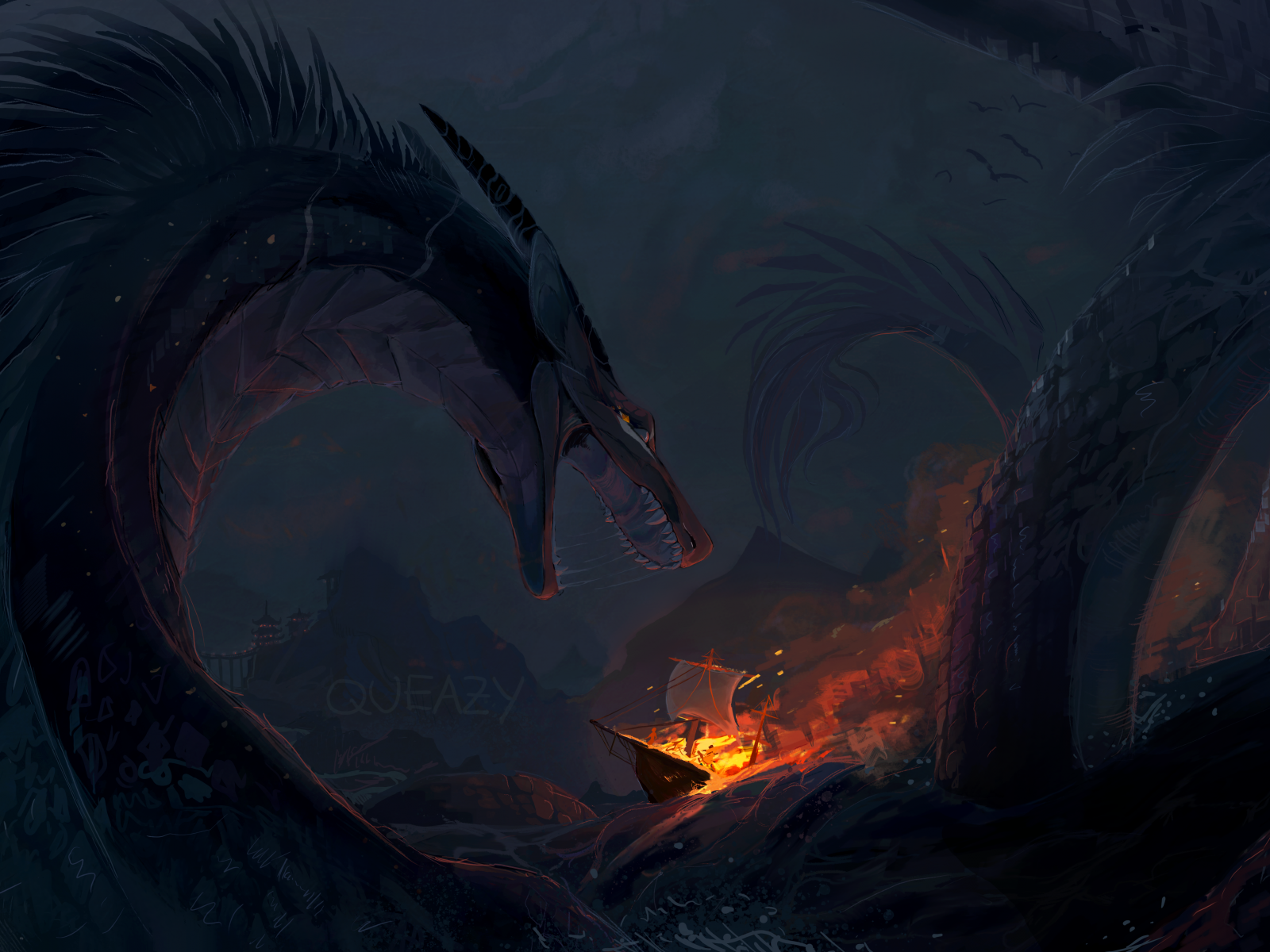 Sea monster attacks boatHD Wallpaper - 1600x1200