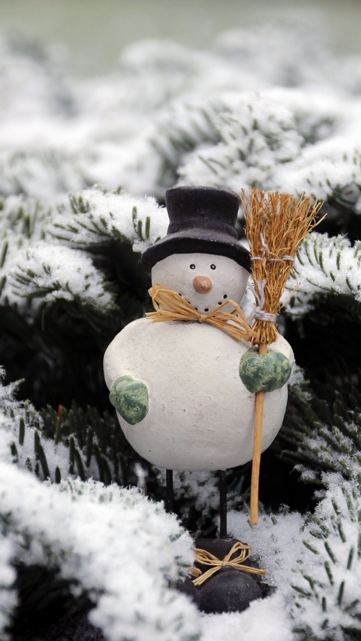Snow Man Wearing Black Hat Holding Brown Broom HD Wallpaper - 720x1280