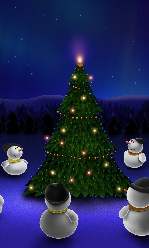 Snowman around Christmas tree HD Wallpaper - 480x800