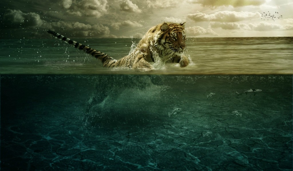 Tiger leap in the water HD Wallpaper available in different dimensions - 1024x600