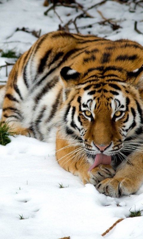 Tiger lying at the snow HD Wallpaper - 480x800