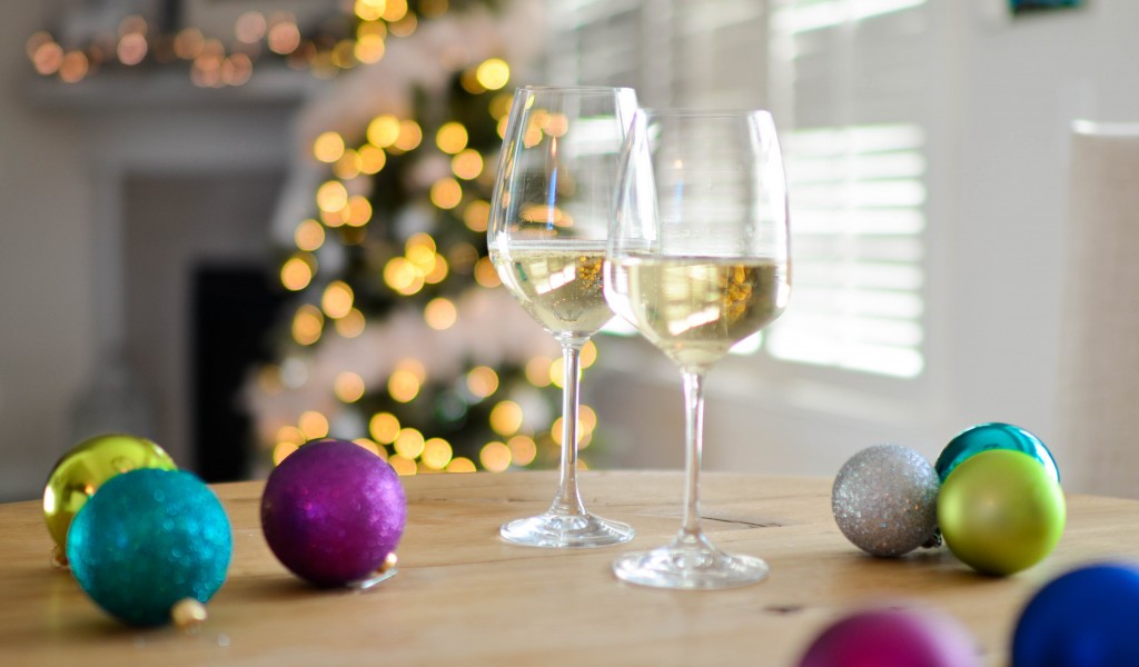 Two Champagne Glasses Near Baubles HD Wallpaper - 1024x600