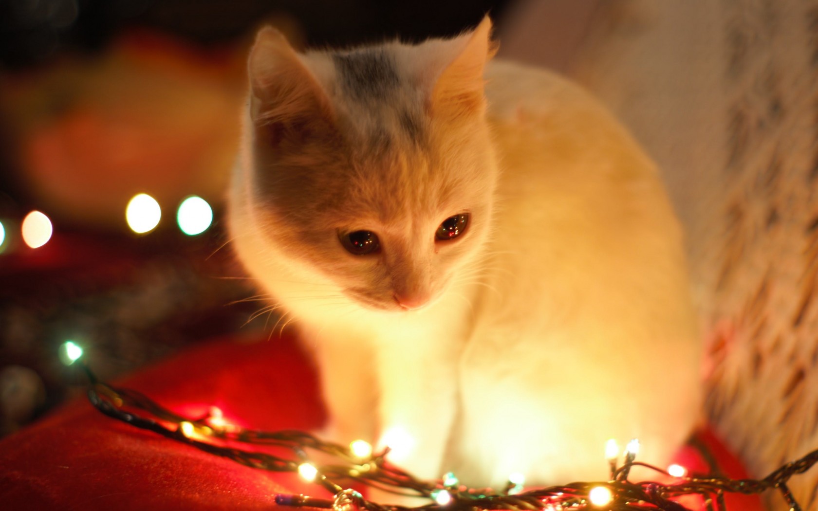 White Cat Besides Christmas Lights HD Wallpaper - 1680x1050